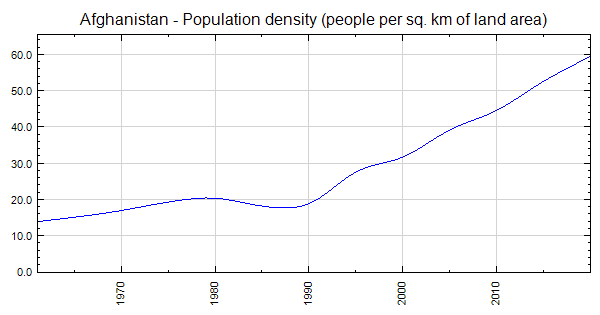 As the graph below shows, over the past 57 years this indicator reached a maximum value of 56.94 in 2018 and a minimum value of 14.04 in 1961. Afghanistan population density was 59.6 persons per sq. The population density of afghanistan in 2019 was 58.27 people per square kilometer, a 2.34% increase from 2018. Afghanistan population density afghanistan population density is 60.8 people per square kilometer (157.4/mi 2) as of july 2021. Density of population is calculated as permanently settled population of afghanistan divided by total area of the country.